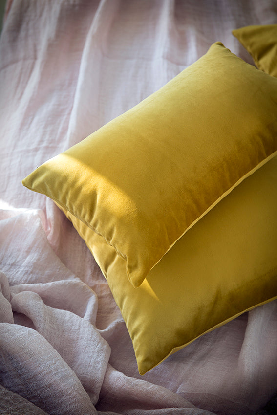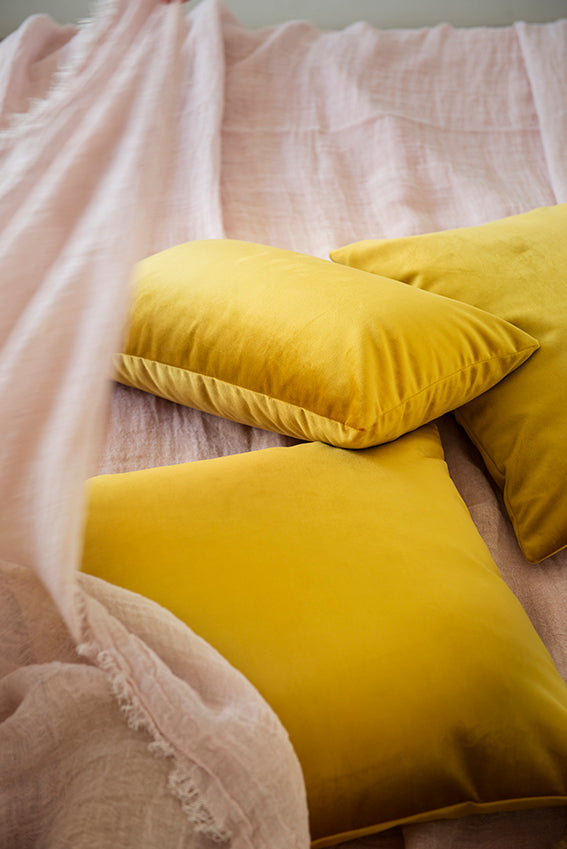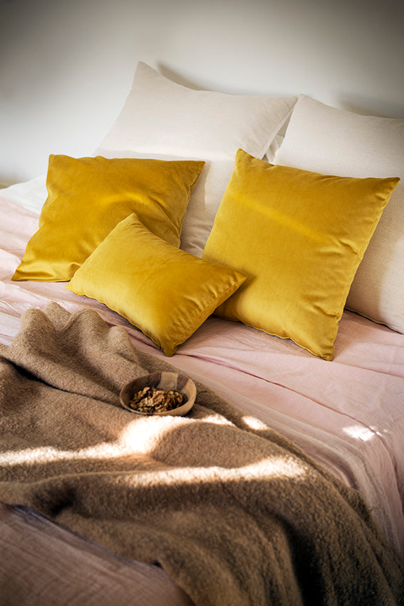 Cojín Artesano confeccionado en terciopelo de algodón color Mostaza. Este cojín es ideal para combinar con tonos neut...