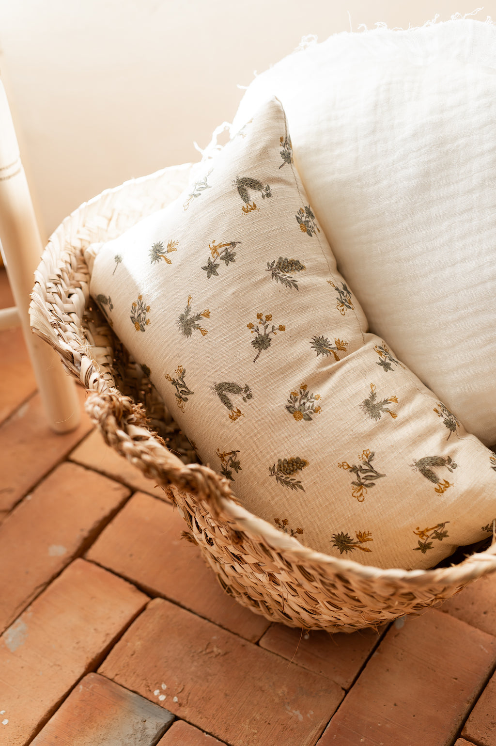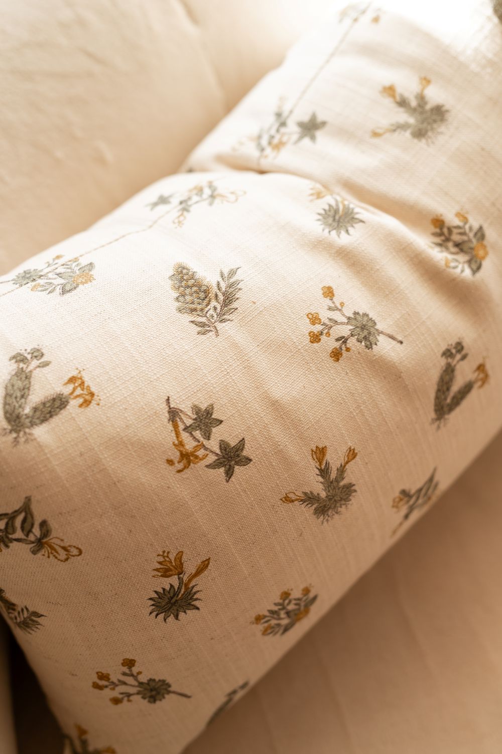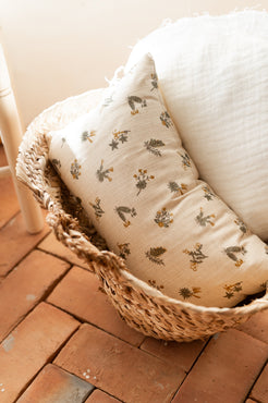Cojín Artesano confeccionado en lino con un precioso estampado de hojas primaverales.