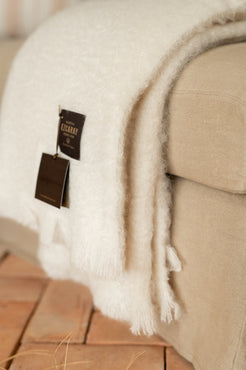 Manta de Mohair en color crudo. Las principales características de esta manta son su ligereza y calidez. Fabricada de manera artesanal en Ezcaray.