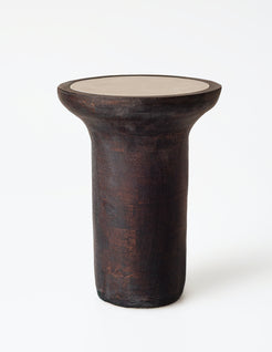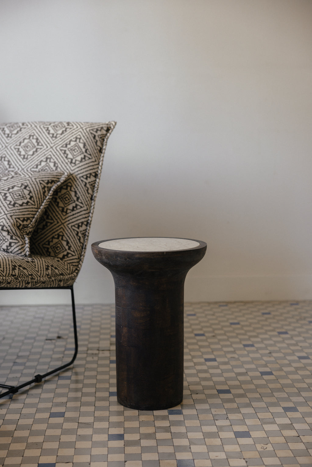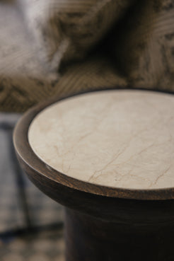 Material: madera de mango en dos tonos. Un tono más oscura para la base y cuerpo de la mesa y un tono claro, casi en crudo, para el acabado superior. Mesa con firma y diseño de tambor étnico.