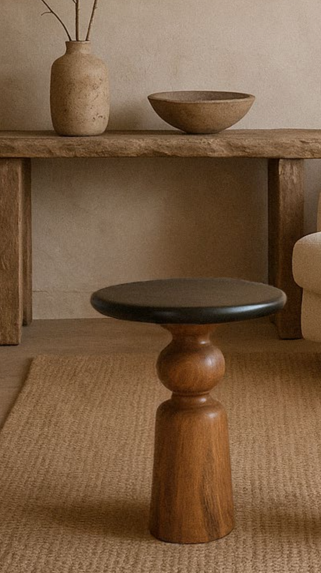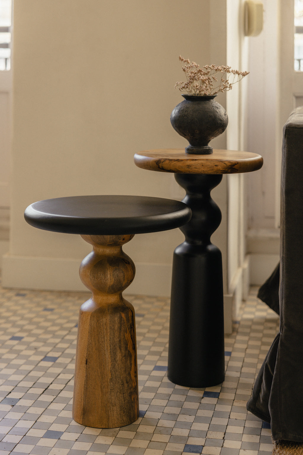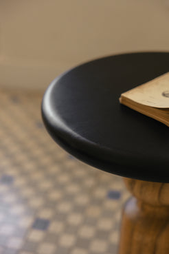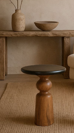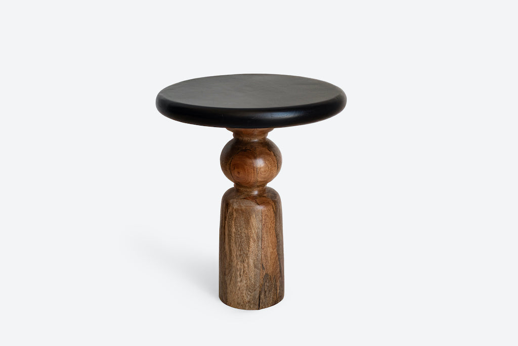 Mesa auxiliar Redonda trabajada en madera de mango en dos tonos: madera natural oscurecida en la base y tablero pintado en color negro. Una mesita auxiliar elegante y sofisticada que llenará la estancia de calidez de hogar gracias a su belleza natural.