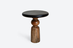 Mesa auxiliar Redonda trabajada en madera de mango en dos tonos: madera natural oscurecida en la base y tablero pinta...