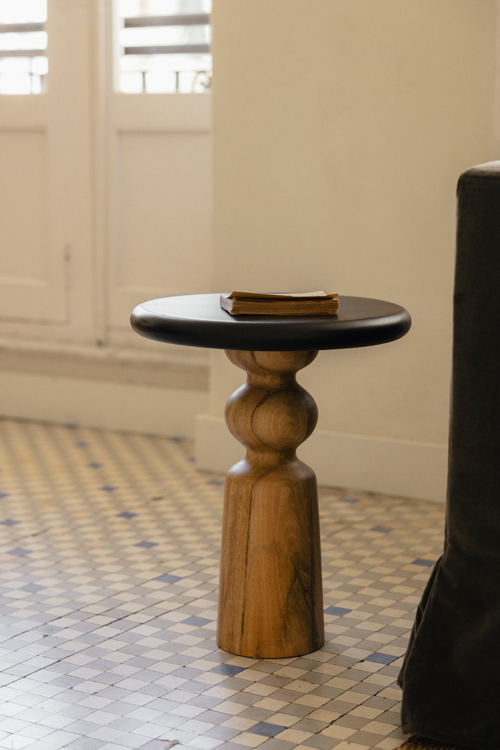 Un tablero redondo pintado en negro aporta contraste con su base en madera.
