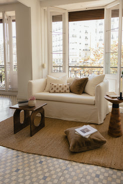 Sofá de lino con pestaña en sus costuras, brazos redondos y asiento en una sola tirada. Un sofá inspirado en la decoración francesa; elegancia relajada gracias a los tejidos naturales, romanticismo sutil, colores lisos, suaves y atemporales. Una decoración que juega con lo urbano y lo rústico encontrando el equilibrio perfecto.